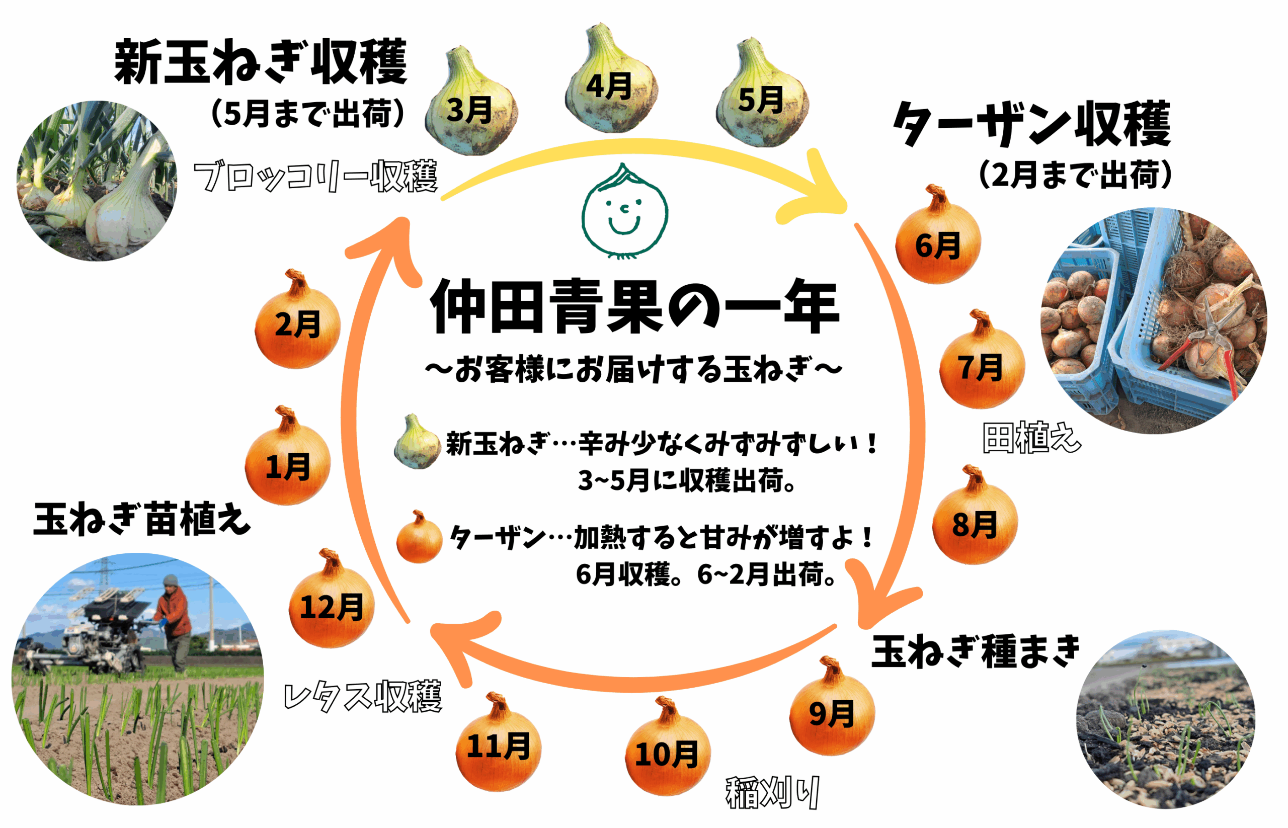 玉ねぎは、収穫できる時期によって、「超極早生」(ちょうごくわせ)、「極早生」(ごくわせ)、「早生」(わせ)、「中生」(なかて)、「晩生」(おくて)と呼ばれています。